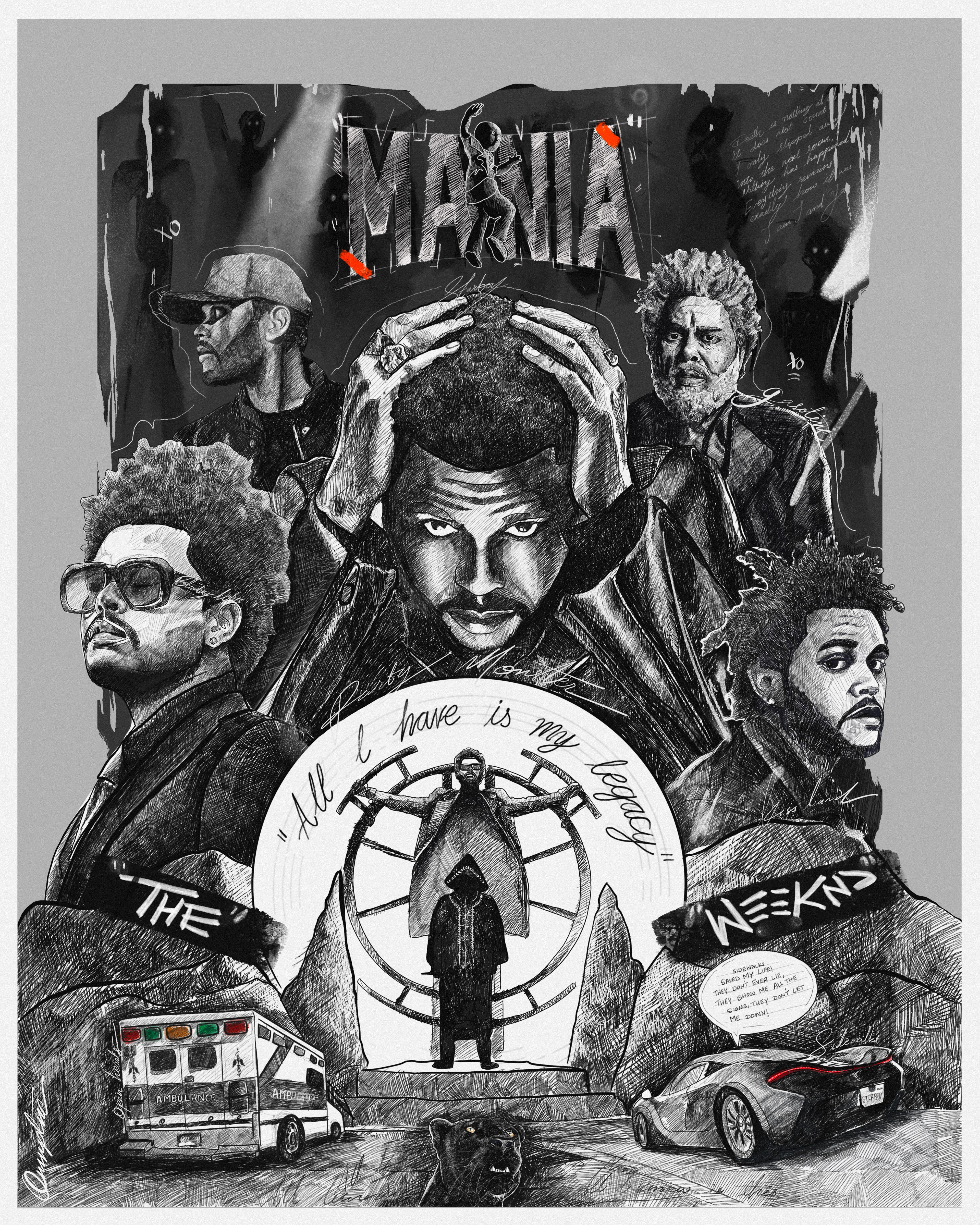 I love listening to 'The Weeknd' music, always unique. So, I thought of creating an illustration that captures his best moments. I've got inspired by his song called 'Mania' which was released in 2016, it's like a short story made of few of his popular tracks.
